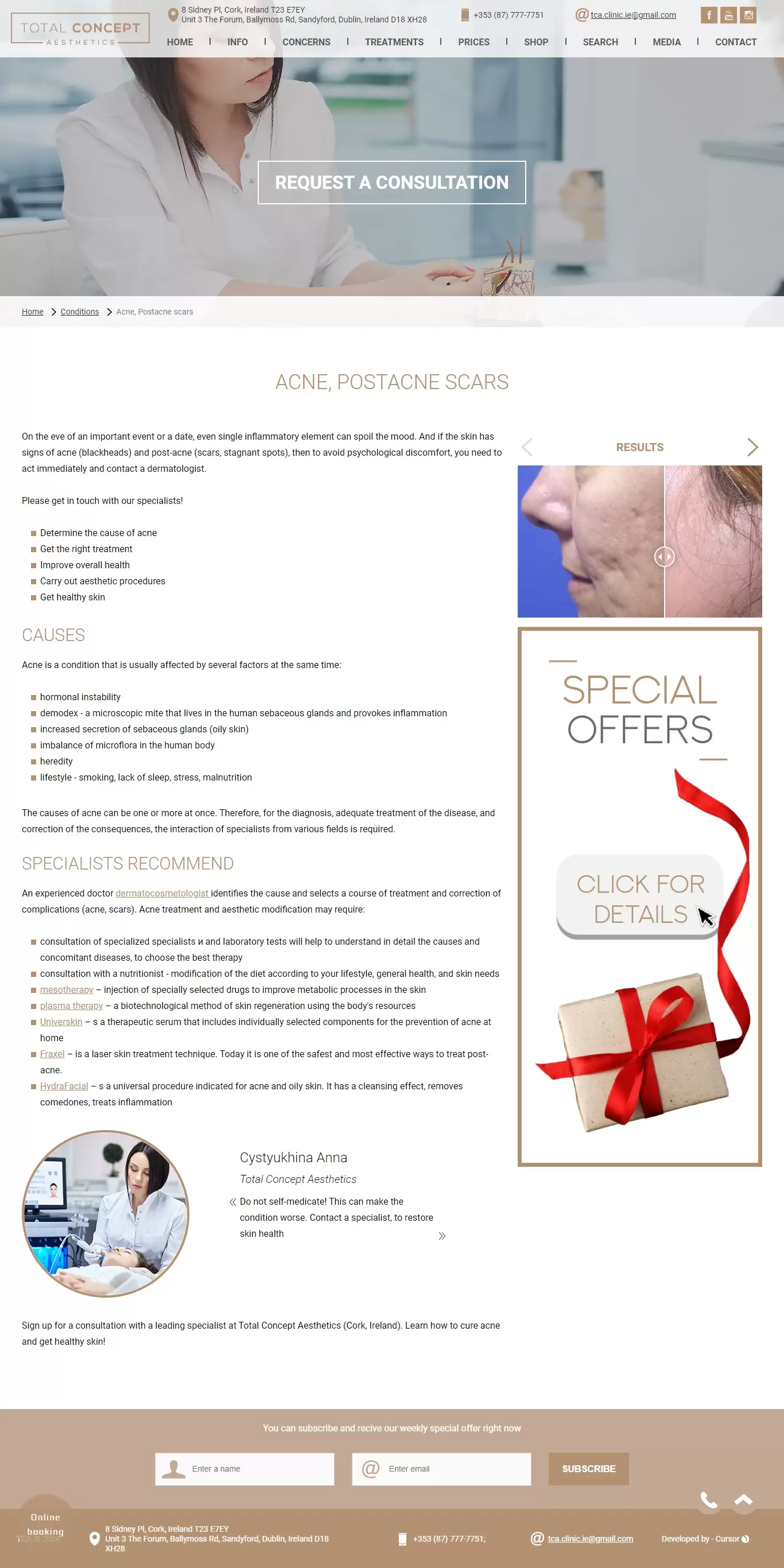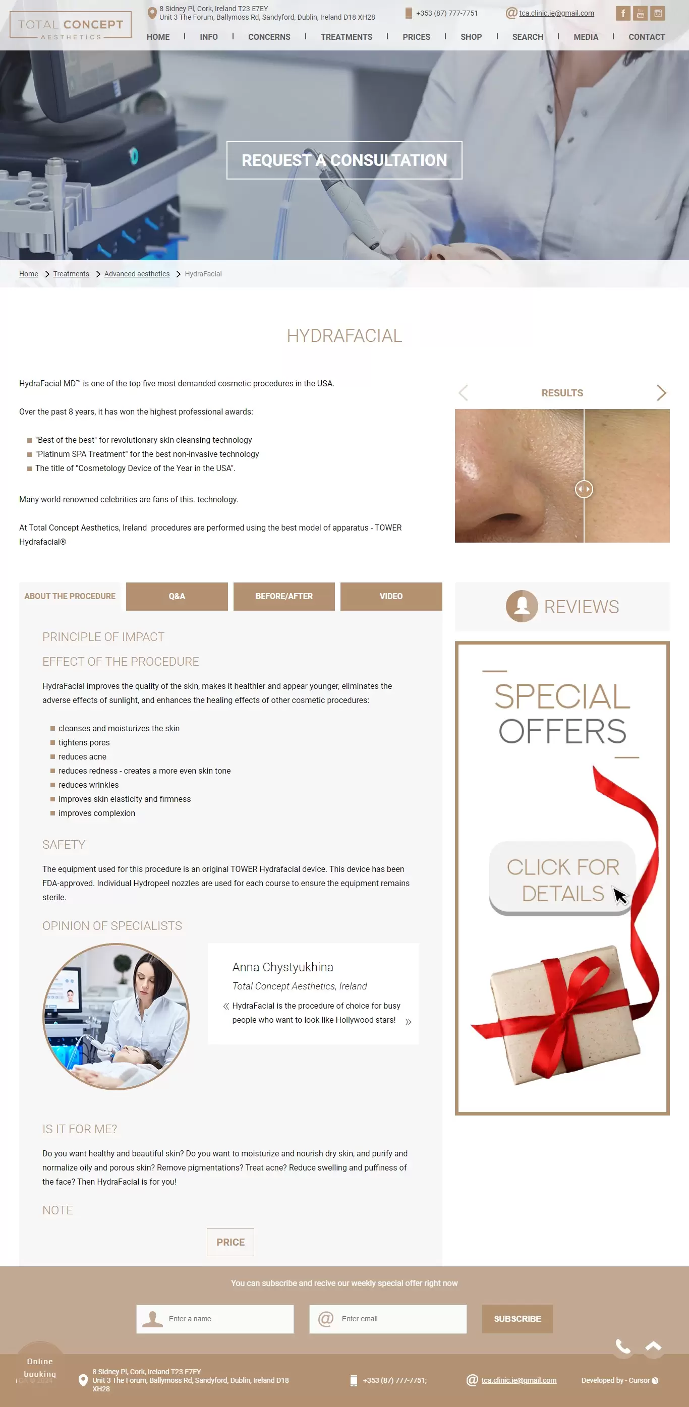 Проект “Total Concept Aesthetics” – это полностью адаптивный сайт на системе управления сайтом «Битрикс». На главной странице выводится максимум необходимой информации о проекте: