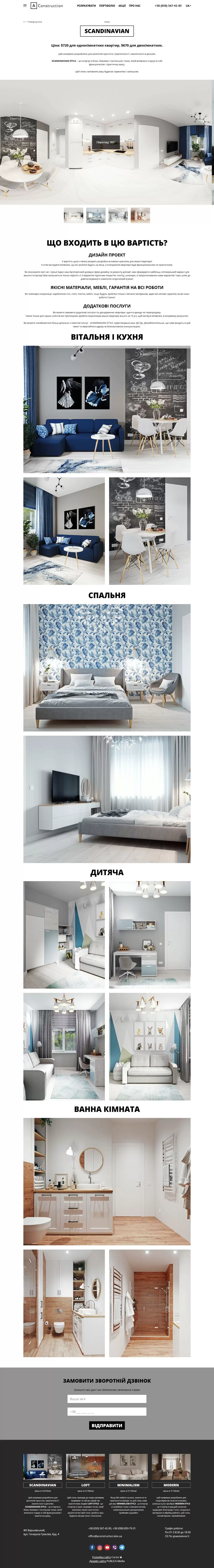 На головній сторінці виводитися іміджевий банер з ефектом анімації. Після цього користувачеві пропонується вибрати стиль інтер'єру з чотирьох можливих. Кожен із стилів представлений набором фотографій і 3-д огляду основних локацій квартири: вітальня і кухня, спальня, дитяча і ванна кімната. Крім основних стилів, компанія робить акцент на те, що можна без проблем зробити проект ремонту квартири за індивідуальним стилем. Завершують головну сторінку інфоблок відгуків клієнтів і веб-форма замовлення зворотного дзвінка. Так само слід зазначити, що в футері виводяться посилання на стилі ремонту, їх короткий опис і вартість за квм.